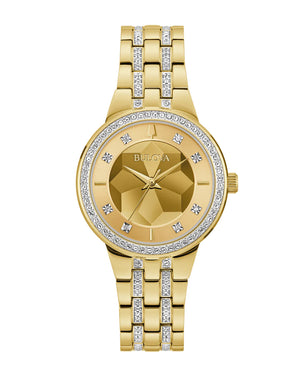 Read MoreA truly captivating masterpiece, this Bulova ladies’ timepiece from the Crystal collection has an ingeniously beautiful dial that is sure to dazzle. Embellished with 112 crystals, the gold-tone stainless steel case and bracelet deliver a stunningly luxurious wrist presence, with a flat mineral crystal offering an uninterrupted view of the magnificent dial. The champagne dial features a faceted motif, with gold-tone accents and hands and 8 sparkling crystal hour markers. The matching gold-tone stainless steel bracelet features a slim foldover closure that maintains the timepiece’s sleek silhouette. Glisten at every angle with this elegant Bulova ladies’ timepiece.