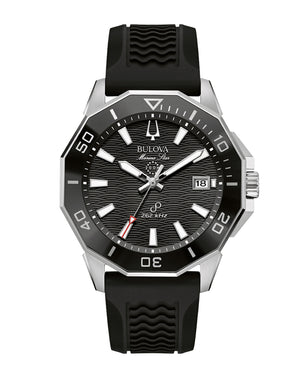 Read MoreAn incredibly bold design, this men’s Bulova Marine Star Precisionist sport watch pushes the limits with Bulova’s cutting-edge technology and a strikingly modern case. Defined by a rugged, angular profile, the 43mm stainless steel case features brushed facets and polished accents, with a unidirectional timing bezel with a ceramic insert, a sapphire crystal, and a screw-down crown ensuring 200m water resistance. The vibrant black dial takes its inspiration from the undulating crests of the ocean, with a wave pattern accented by applied hour markers and a bold handset, all featuring luminescent material for unrivalled legibility in all conditions. A date window is positioned at 3 o’clock, while the red-tipped seconds hand sweeps smoothly around the dial thanks to Bulova’s proprietary Precisionist movement, a revolutionary 8-jewel quartz mechanism vibrating at a remarkable 262kHz and accurate to 10 seconds per year with increased resistance to temperature changes. Paired with a durable silicone strap with a pin buckle closure, this men’s Bulova timepiece is equipped to handle everything from the office to the ocean.
