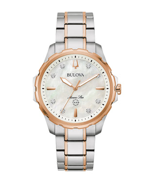 Read MoreFrom the legendary Bulova Marine Star collection, this sporty and elegant ladies’ timepiece offers unrivaled style. The rose gold and silver-tone stainless steel case features a modern design with a bold crenellated fixed bezel and symmetrical case flanks. A flat sapphire crystal and protected crown provide modern reliability which is furthered by 100m of water resistance. The iridescent mother-of-pearl dial adds a captivating twist to the timepiece, with eight diamond hour markers and a refined rose gold-tone handset with luminescent fill for superb legibility in all conditions. The watch is paired with a matching two-tone quick-release stainless steel bracelet with a push-button deployant closure that provides both comfort and security. For timeless elegance no matter the occasion, this Bulova ladies’ timepiece makes the perfect companion.