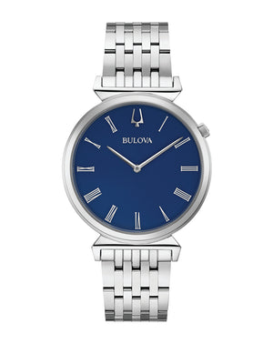 Read MoreInspired by Bulova heritage timepieces, the silver tone stainless steel Regatta features slim Roman numeral markers on a blue dial, the crown at the 2 o‚clock position, and unique angled lugs. Flat sapphire crystal, slim quartz movement, and water resistance to 30 meters.
