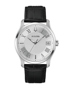 Read MoreVersatile elegance is evident in the many features and details of the Wilton 3 hand quartz timepiece from the Bulova Classic collection. This watch features a brushed silver-tone stainless steel case set with a white 3-hand dial with a clous de paris intricately textured detail, calendar, polished Roman numeral markers, and a domed crystal. The smooth black leather strap fastens with a deployant buckle with pushers for easy release. Get back to basics in style with the classic Wilton from Bulova.