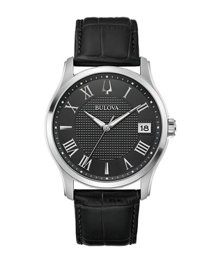 Read MoreVersatile elegance is evident in the many features and details of the Wilton 3 hand quartz timepiece from the Bulova Classic collection. This watch features a brushed silver-tone stainless steel case set with a striking black 3-hand dial with a clous de paris intricately textured detail, calendar, polished Roman numeral markers, and a domed crystal. The smooth black leather strap fastens with a deployant buckle with pushers for easy release. Get back to basics in style with the classic Wilton from Bulova.