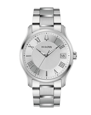 Read MoreVersatile elegance is evident in the many features and details of the Wilton 3 hand quartz timepiece from the Bulova Classic collection. This watch features a brushed silver-tone stainless steel case set with a white 3-hand dial with a clous de paris intricately textured detail, calendar, polished Roman numeral markers, and a domed crystal. The silver-tone stainless steel bracelet features a deployant buckle with pushers for easy release. Get back to basics in style with the classic Wilton from Bulova.