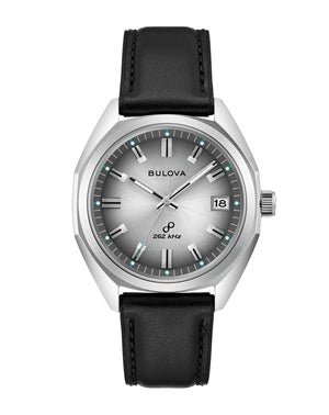 Read MoreStraight from the 1970s comes this Bulova Jet Star "F", an iconic model from the brand's impressive history, now equipped with an equally impressive movement. Borrowing from its historic forebear, the stainless-steel case features a striking angular design with broad facets and a domed sapphire crystal. A gray chapter ring accents the vivid silver-tone sunburst dial, applied black and silver hour markers and black accented hands. Luminescent plots at each hour and fill-in the hands allow for exceptional legibility in every environment, while a date display sits perfectly at 3 o'clock. Bulova's Precisionist movement powers the new Jet Star, a revolutionary 8-jewel quartz mechanism vibrating at a remarkable 262kHz, accurate to 5 seconds per month with increased resistance to temperature changes, and with a sweeping seconds hand. Complementing the stainless-steel case is a black leather strap. Strut your stuff in legendary style with the high-flying Bulova Jet Star "F", a legendary design recreated for the modern connoisseur.