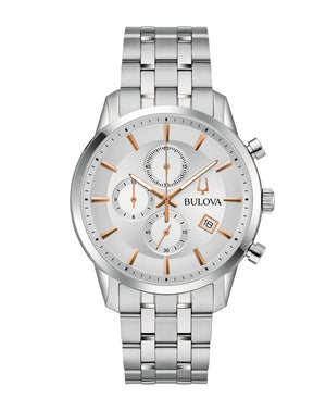 Read MoreExploring clean lines and minimalist design. As part of Bulova's Sutton collection, this timepiece features a silver 6-hand chronograph dial, rose gold hands and markers, a rose gold-framed date window, a stainless-steel case and a matching bracelet, staying true to Bulova's timeless aesthetic.