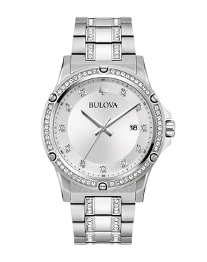 Read MoreFrom the Bulova men’s Crystal collection, a box set that exudes glamorous confidence. Impressively rendered in silver-tone stainless steel and set with 118 crystals, the case and matching bracelet feature sharp, dramatic faceting and a blend of brushed and polished finishes with a flat mineral crystal. The lively sunray dial is appointed with a silver-tone handset and 11 crystal hour markers. Completing this striking set is a bold bracelet set with 260 crystals in a full pave Cuban link design with a tuning fork clasp. This Bulova men’s timepiece and bracelet box set is an unrestrained expression of self.