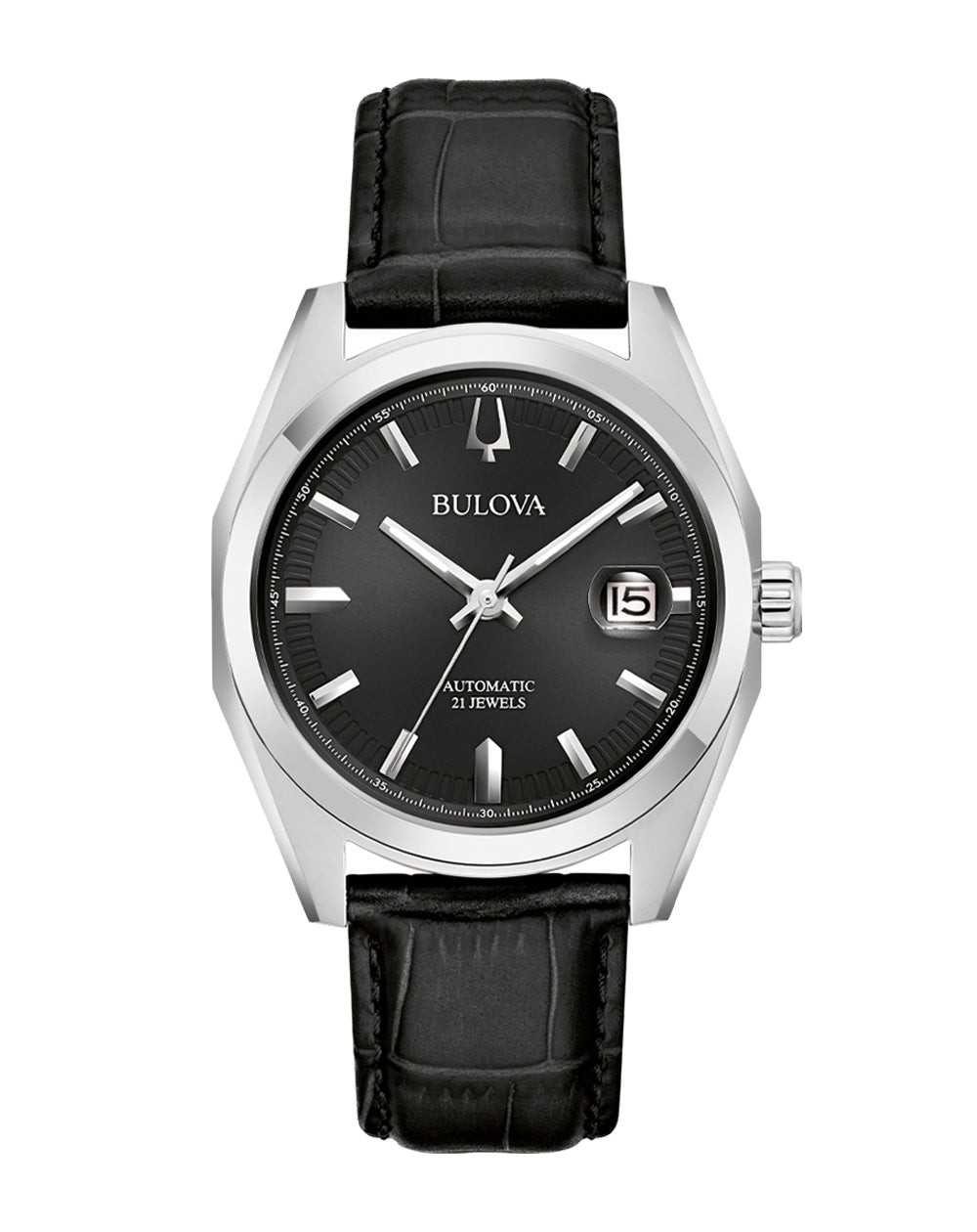 The Bulova men’s Surveyor is defined by exceptional quality and sophisticated aesthetics. The silver-tone stainless steel case features sculpted edges and faceting which provide an effortless wear on the wrist, with polished and brushed finishing, a flat sapphire crystal, and a matching rubber strap . The striking and features silver-tone accents, hands with luminescent fill, debossed minute markers, and a magnified date display. The watch is powered by an automatic 21-jewels and a 42-hour power reserve, which can be seen in full through a mineral crystal exhibition window in the caseback. For those with a discerning eye for refined luxury, this Bulova men’s timepiece is the obvious choice.