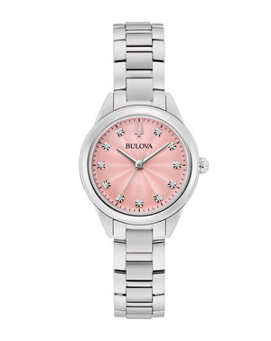 Read MoreAdd a pop of color to your wardrobe with this stylish Bulova ladies’ timepiece from the Sutton collection. The silver-tone stainless steel case is tastefully finished with brushing and polishing, with a domed sapphire crystal for clarity. The pastel pink sunray dial is an exercise in elegant simplicity, with 11 dazzling diamond hour markers, slim hands, and the tuning fork logo at 12 o’clock. The watch is paired with a matching 3-link stainless steel bracelet with a foldover closure. Push your palette to the limit with this petite Bulova ladies’ timepiece.