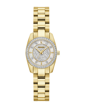 Read MoreA dazzling display of luxurious design, this Bulova ladies’ box set includes a Crystal collection timepiece and two bracelets. The gold-tone stainless steel case of the timepiece features a tapering design the curves effortlessly around the wrist, with brushed finishing and polished accents and embellished with 48 crystals. The mother-of-pearl dial features gold accents, 8 sparkling crystal hour markers, and a pave center formed by 102 meticulously set crystals. The timepiece is completed with a matching gold-tone stainless steel bracelet with a deployant buckle. Complementing the timepiece are two bracelets: a refined gold-tone memory bangle with mother-of-pearl hearts bordered with 36 crystals and a contemporary gold-tone bolo chain bracelet, alternating with small mother-of-pearl hearts and larger pave crystal hearts with a total of 38 crystals. As versatile as it is stylish, this Bulova ladies’ box set can be worn all at once or separately, perfect for accompanying you day to day.