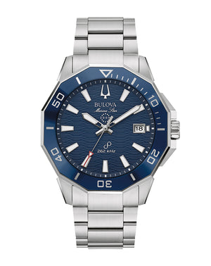 Read MoreAn incredibly bold design, this men’s Bulova Marine Star Precisionist sport watch pushes the limits with Bulova’s cutting edge technology and a strikingly modern case. Defined by a rugged, angular profile, the 43mm stainless steel case features brushed facets and polished accents, with a unidirectional timing bezel with a ceramic insert, a sapphire crystal, and a screw-down crown ensuring 200m water resistance. The vibrant blue dial takes its inspiration from the undulating crests of the ocean, with a wave pattern accented by applied hour markers and a bold handset, all featuring luminescent material for unrivaled legibility in all conditions. A date window is positioned at 3 o’clock, while the red-tipped seconds hand sweeps smoothly around the dial thanks to Bulova’s proprietary Precisionist movement, a revolutionary 8-jewel quartz mechanism vibrating at a remarkable 262kHz and accurate to 10 seconds per year with increased resistance to temperature changes. Paired with a durable stainless steel bracelet with a pin buckle closure, this men’s Bulova timepiece is equipped to handle everything from the office to the ocean.