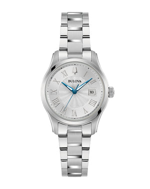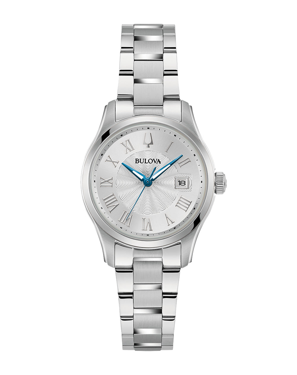 Read MoreVersatile elegance is evident in the many features and details of the Wilton 3 hand quartz timepiece from the Bulova Classic collection. This watch features a brushed silver-tone stainless steel case set with a white 3-hand dial with a clous de paris intricately textured detail, calendar, polished Roman numeral markers, and a domed crystal. The silver-tone stainless steel bracelet features a deployant buckle with pushers for easy release. Get back to basics in style with the classic Wilton from Bulova.