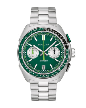 Read MoreBuilt on Bulova’s vibrant history in motorsport – from soap box derbies to the upper echelons of auto racing – the men’s 5-hand chronograph Racer watch is fine-tuned and designed for performance. Stainless steel is contoured to create a case featuring unique design that evokes the aerodynamic curves of the world’s fastest automobiles. A two-tone green and black tachymeter ring offers further functionality, while pronounced pushers provide a distinctively automotive aesthetic. Emphasizing the watch’s motorsport roots, the green dial features a racing pattern chapter ring, with a date display at 6 o’clock and silver subdials displaying the chronograph minutes and the running seconds indicator. A vibrant green chronograph seconds hand ensures optimal legibility no matter the speed. The dial is appointed with applied silver-tone markers and matching beveled hands, all filled with bright luminescent material for low-light visibility. The watch is paired with a 3-link stainless-steel bracelet with a deployant clasp for a secure fit. Whether gripping the wheel around the bend at the track or on your daily commute, the Bulova men’s Racer chronograph is a stylish expression of racing history and a passion for speed.