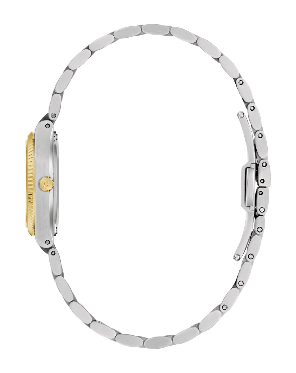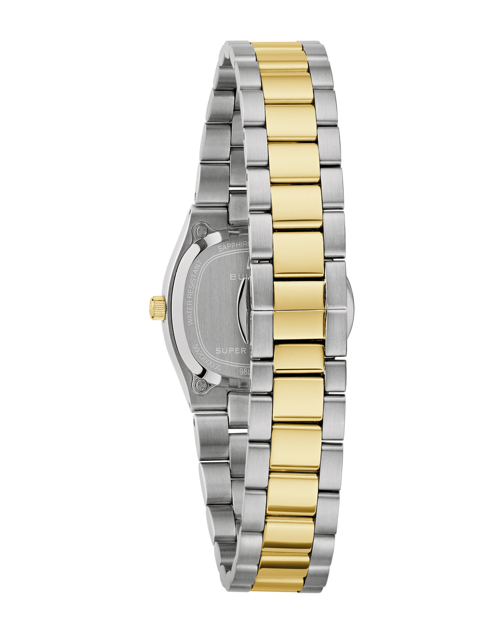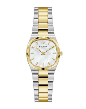 Read MoreDrawing inspiration from the incredible Bulova Super Seville of the 1970s, the Bulova Super Seville Mini delivers classic aesthetics for timeless appeal. With versatility for every wardrobe, the 25mm gold- and silver-tone stainless steel case impresses with a seamless silhouette transitioning into the matching integrated 3-link bracelet, which features a push-button deployant clasp. An elegant, grooved coin edge bezel enhances the case and surrounds a flat sapphire crystal. Iridescent and mesmerizing, a white mother-of-pearl dial is appointed with polished gold-tone hands. Embrace an effortless elegance with the women’s Bulova Super Seville Mini.